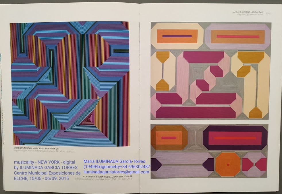 2015 "GEOMETRIA COLOR y MUSICALIDAD" catálogo y exposición by ILUMINADA GARCIA-TORRES (1949Elche-Elx SPAIN) GEOMETRIA combinables:Digital "EL HILO DE ARIADNA-MUSIC: MADRID-AFRICA-PARIS-SWEDEN-MUMBAI BOMBAY-LATINOAMÉRICA-NEPAL-GRECIA-TOKYO-EUROPA-UNIVERSO-NEWYORK-BROOKLYN-BEIJING-BERLIN, pinturas "TRAZADO ESPACIAL CONTINUO" MACE Museo de ELCHE. Plaza San Juan 15may-06sept 2015 España. Expo"ARIADNE'S THREAD-MUSIC" digital geometría ATENEO CIENTÍFICO ARTÍSTICO de ALICANTE 07-30 oct 2014 c.Navas 32.
